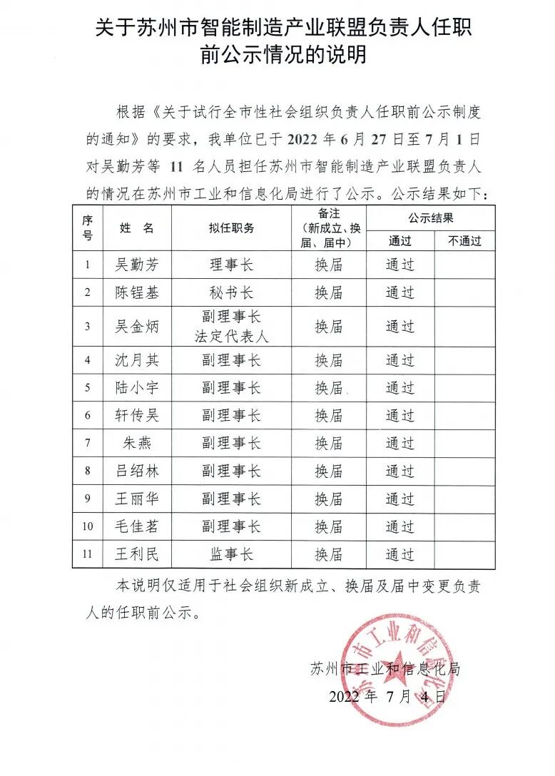 关于苏州市智能制造产业联盟负责人任职前公示情况的说明